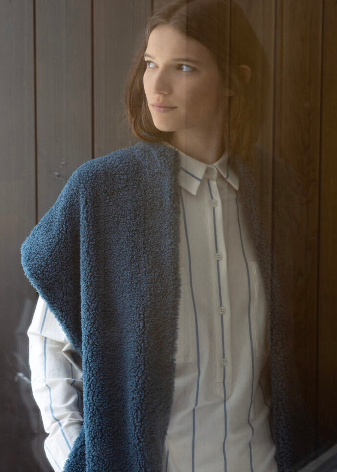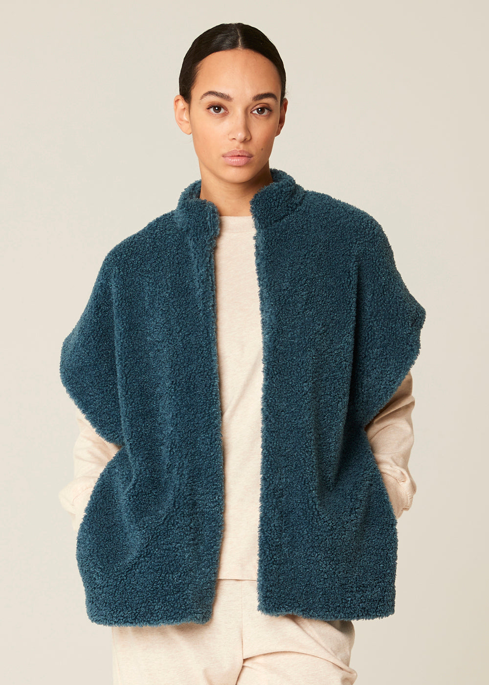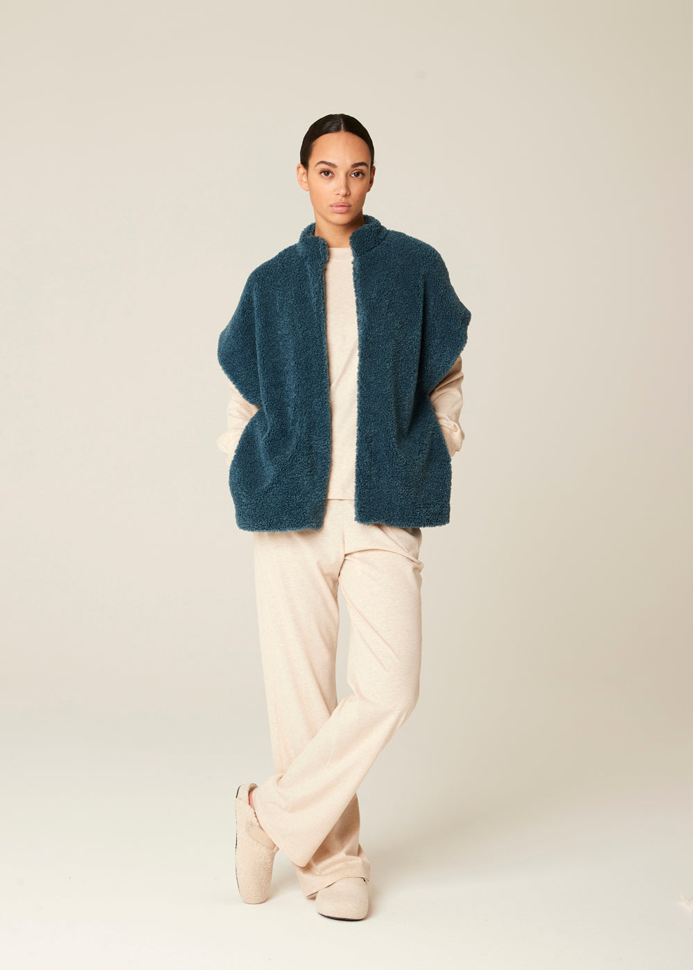 Pluto kurzer Cardigan DAFNA petrolblau aus Sherpa-Fleece mit Taschen kurzärmlig