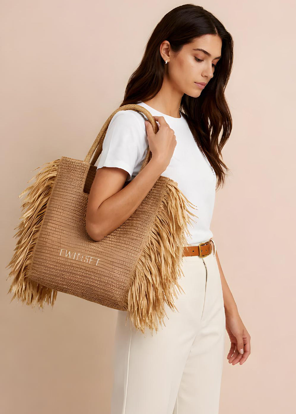 Die harmonische Naturfarbe lässt sich vielseitig kombinieren – von luftigen Sommerkleidern bis hin zu lässigen Denim-Outfits. Die geflochtene Optik sorgt für eine hochwertige, strukturierte Oberfläche, während die Fransen einen trendigen Akzent setzen.
