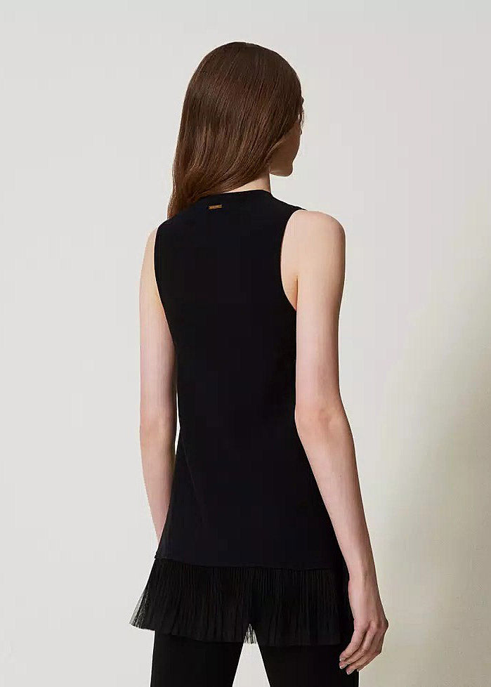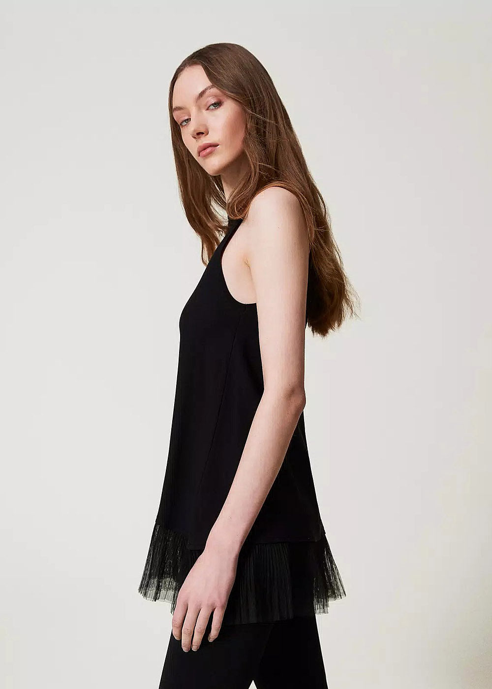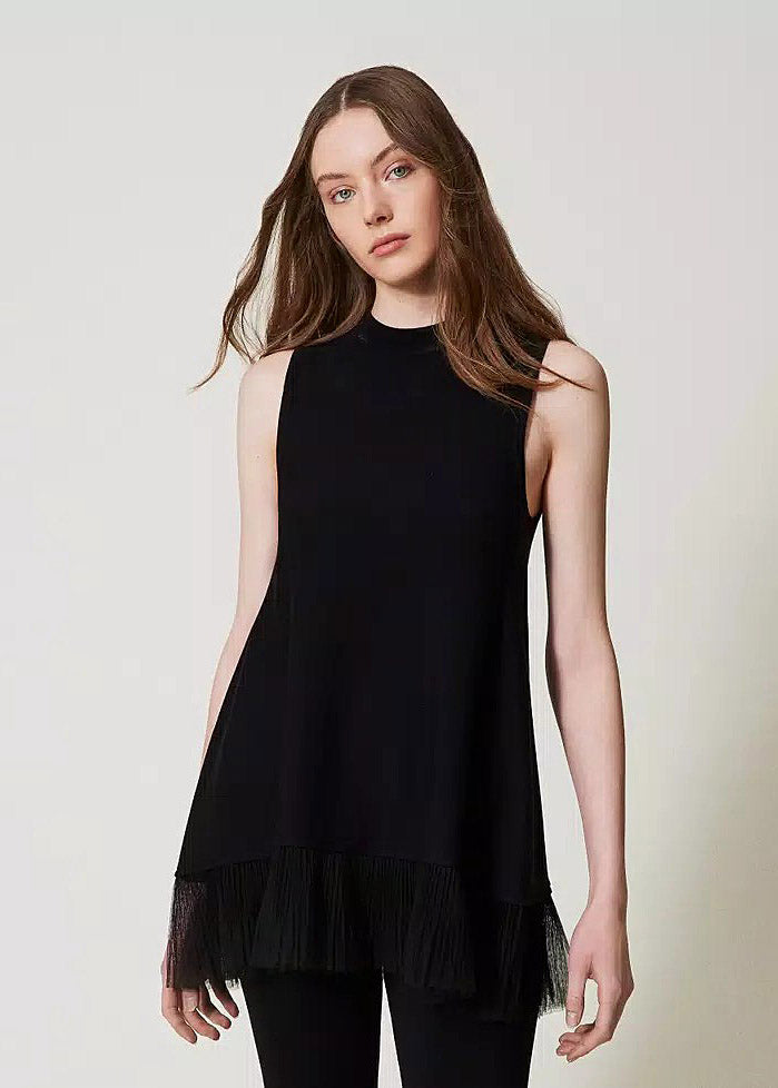 Leicht, elegant, mit einem Hauch Drama: Dieses lange Top von Twin-Set mit Tüllvolants verleiht deinem Look eine feminine und zugleich moderne Note. Die fließende Silhouette wird durch die zarten Volants stilvoll ergänzt – perfekt für raffinierte Layering-Looks oder als Statement-Piece zu schmalen Hosen.
